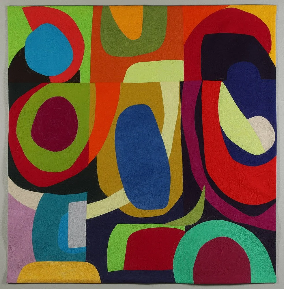 It is a quilt belonging to my AfterParty series, because everyone knows the real fun starts when the party is officially over. I dyed fabrics in bright colors, then cut them into wild dancing shapes. The quilting is energetic and sinuous, and although each color belongs to its shape, the thread vibrates and wiggles out of bounds.